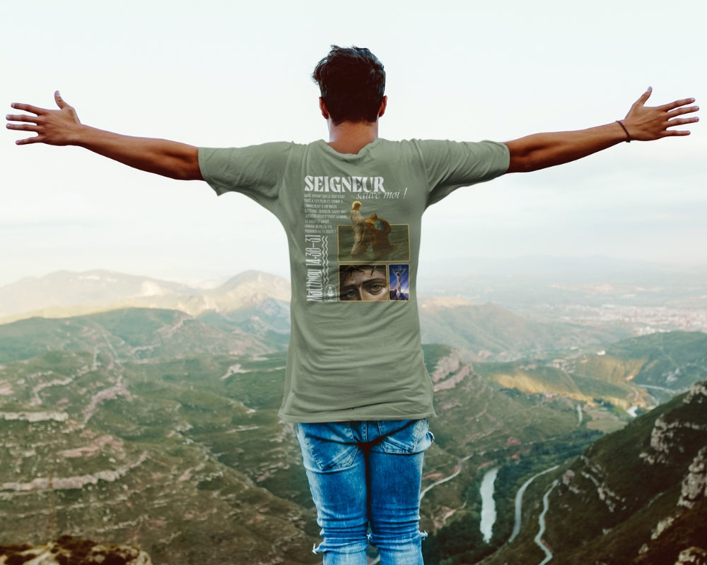 ✝️ Ce t-shirt rend hommage à Matthieu 14:30-31, un passage marquant où la peur rencontre la foi :